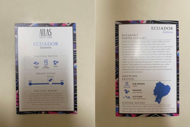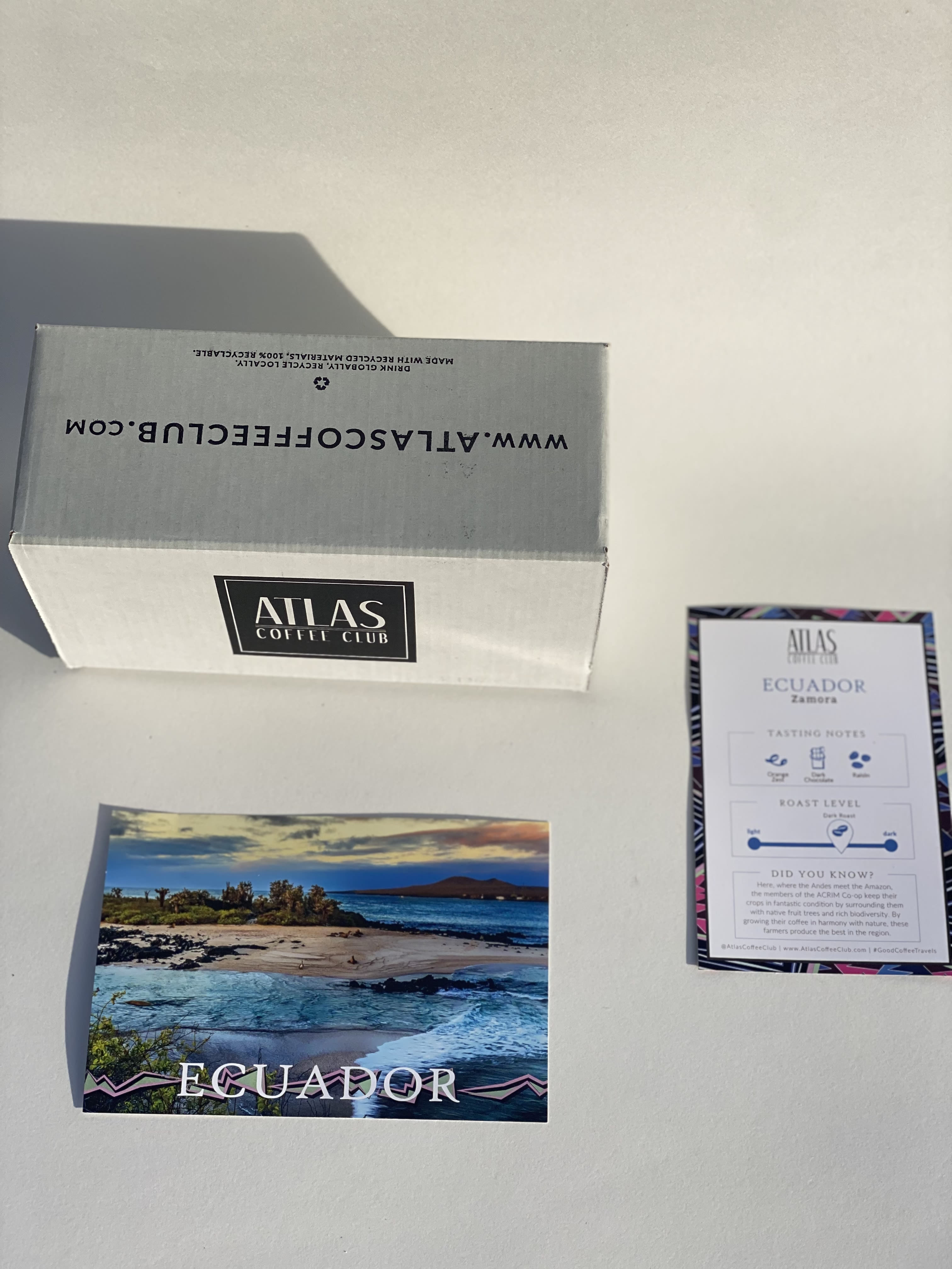 Coffee lovers out there, this is your sign to ditch your old brews. Overall, Atlas Coffee Club was such a great experience. If you aren’t scared of a little adventure, I would 100% recommend their service! With each shipment, you will learn a new story by exploring and curating coffees from countries around the world. Ecuador cultivates some of the best, specialty coffee beans in the world due to its rich biodiversity. This is best suited for those who enjoy a cup of medium to dark roasts. You will receive your hand picked and hand crafted box including an Ecuador postcard, info card, and your selection of grind type in 3 to 6 days. The Atlas Coffee Club Ecuador brewed a great tasting AND smelling cup of coffee. Grown at an altitude of 1,800- 2,000 meters, this dark roast develops taste notes of Orange Zest, Dark Chocolate, Raisin and clean finish of key lime pie with chocolate, sea salt, and raspberries.