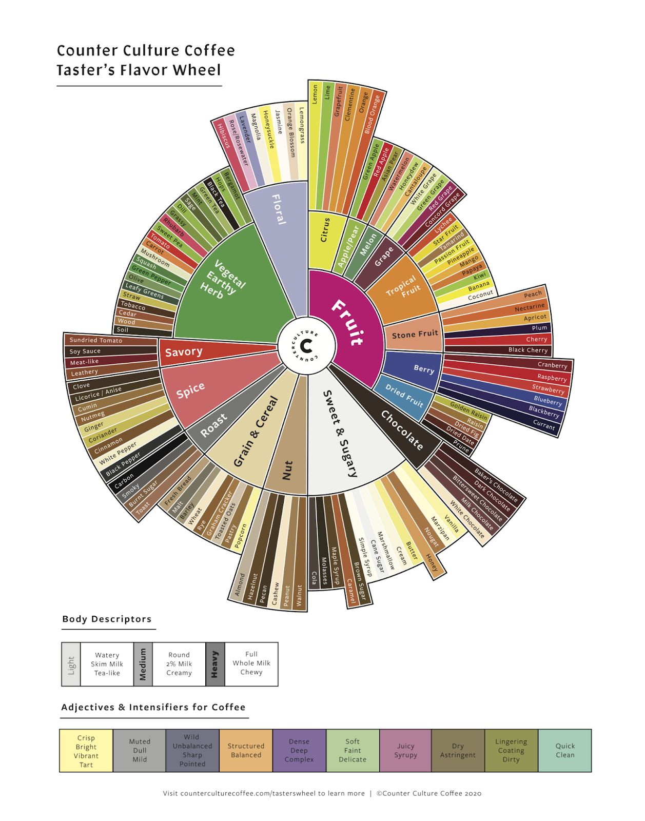 The Specialty Coffee Association designed to be a tool for the coffee tasters. The tasting wheel that helps organize and categorize coffee tasting notes. Although it may be an eyesore, it is easy to understand and simply shows how complex those coffee flavors are.
