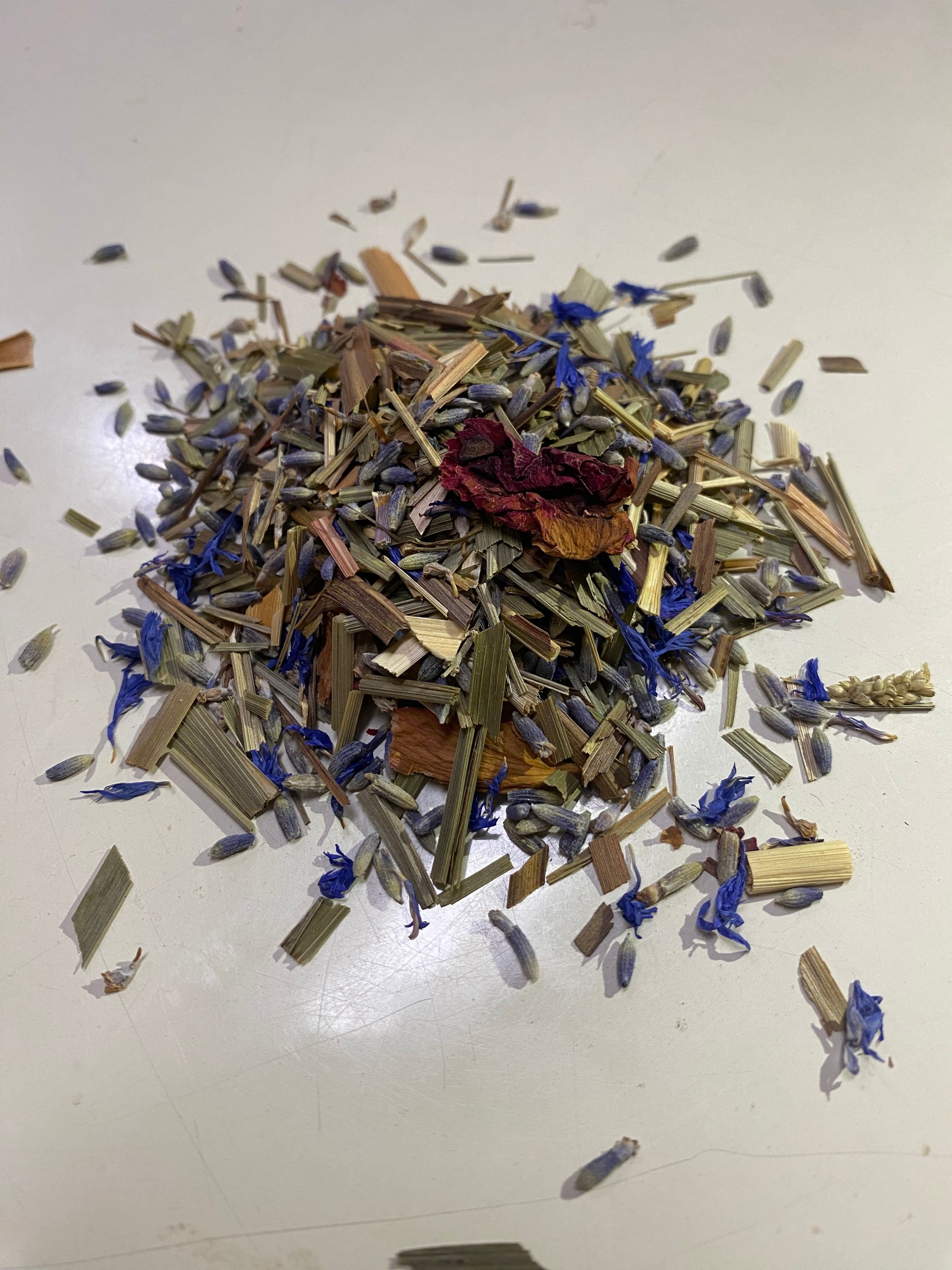 The ingredients inside this specific tea includes: lavender, cornflowers, blue mallow blossoms, rose petals, lemongrass, lemon and mango.